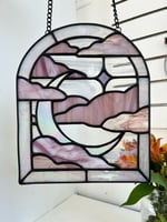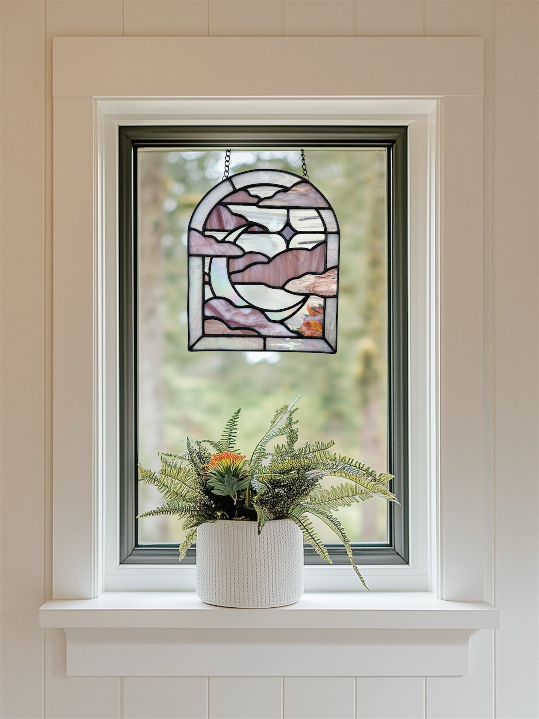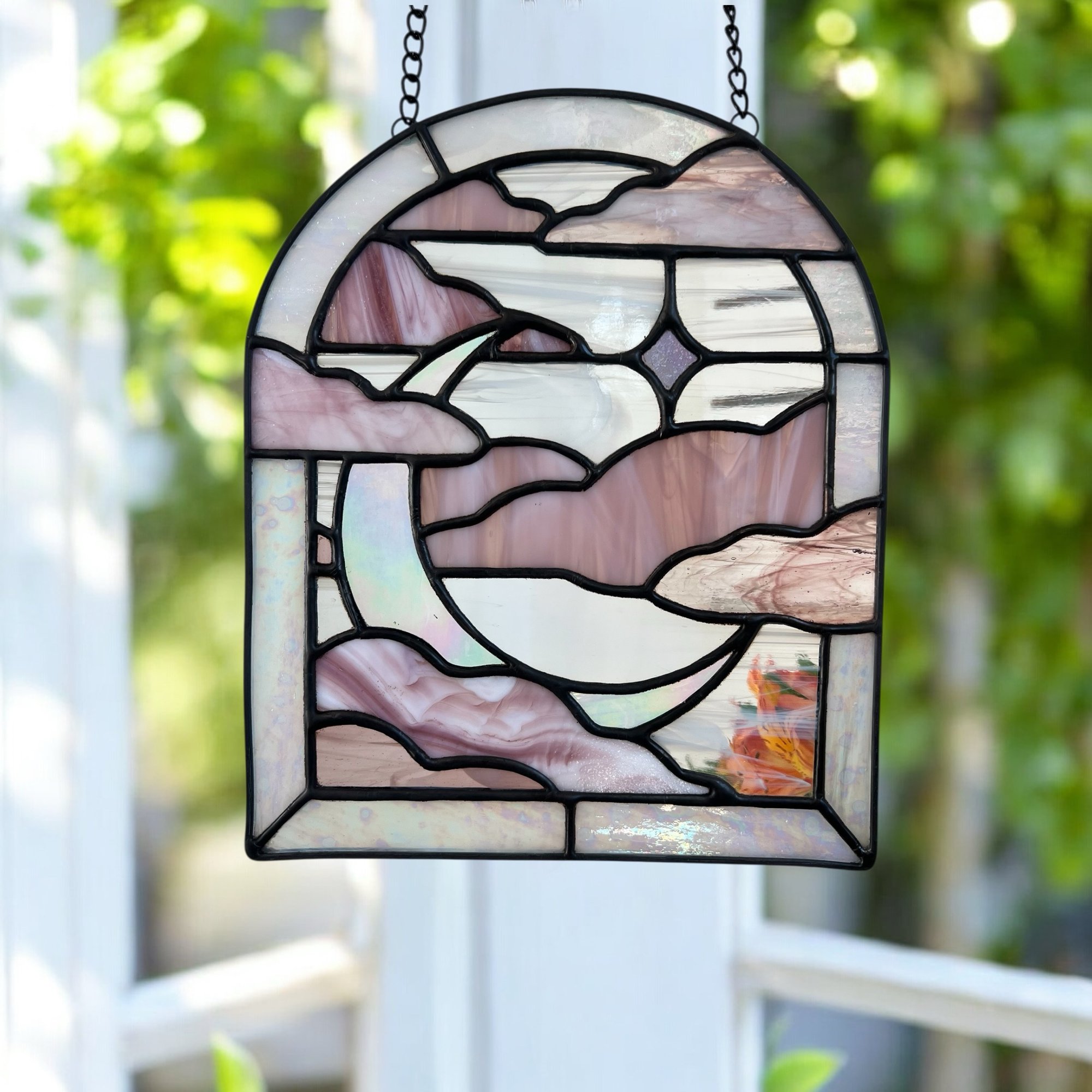 Soft lavender and iridescent glass come together to create a dreamy night sky with a crescent moon and drifting clouds. Perfect for a sunny window or cozy corner—this piece glows beautifully as the light changes throughout the day. ✨