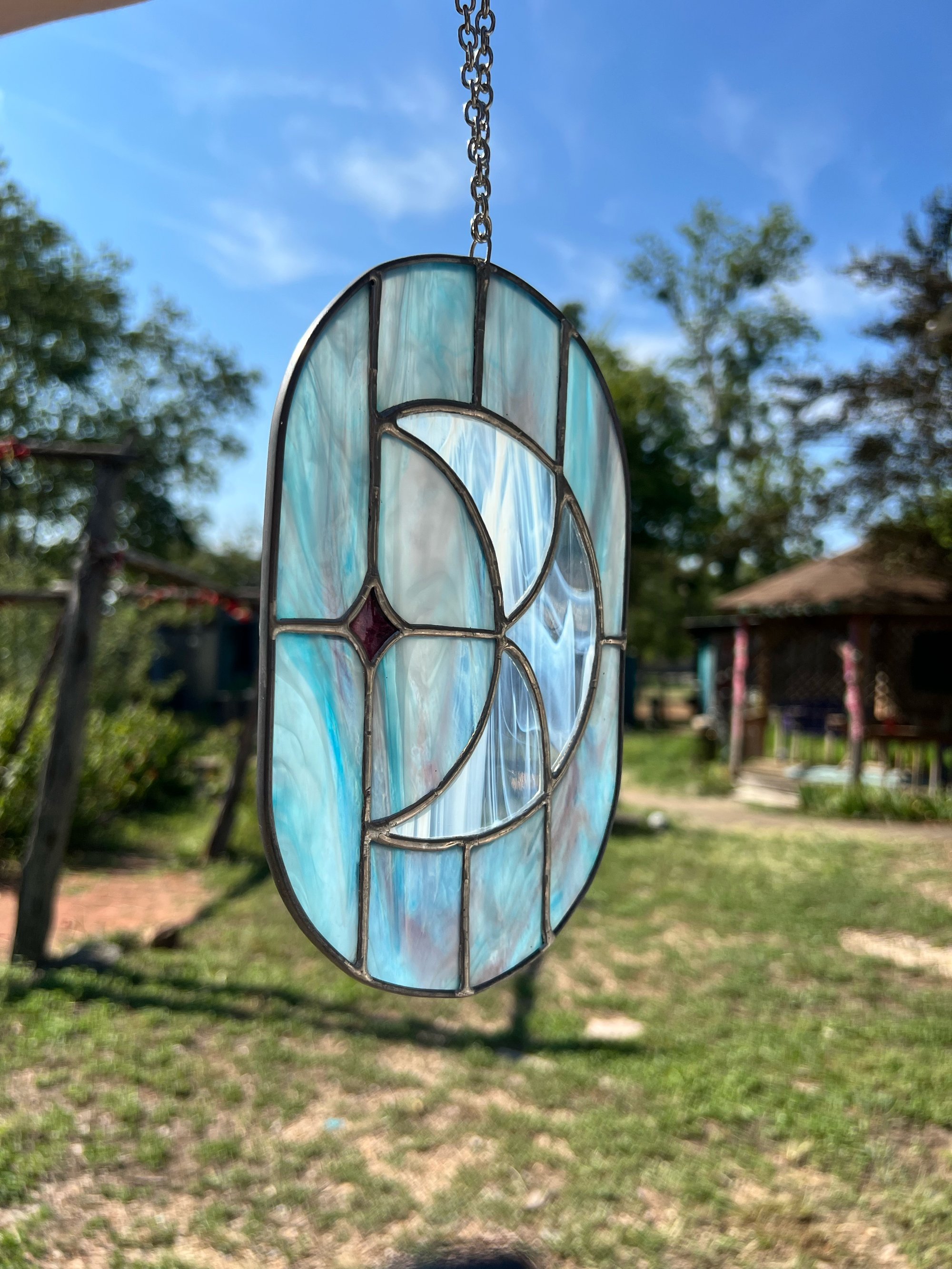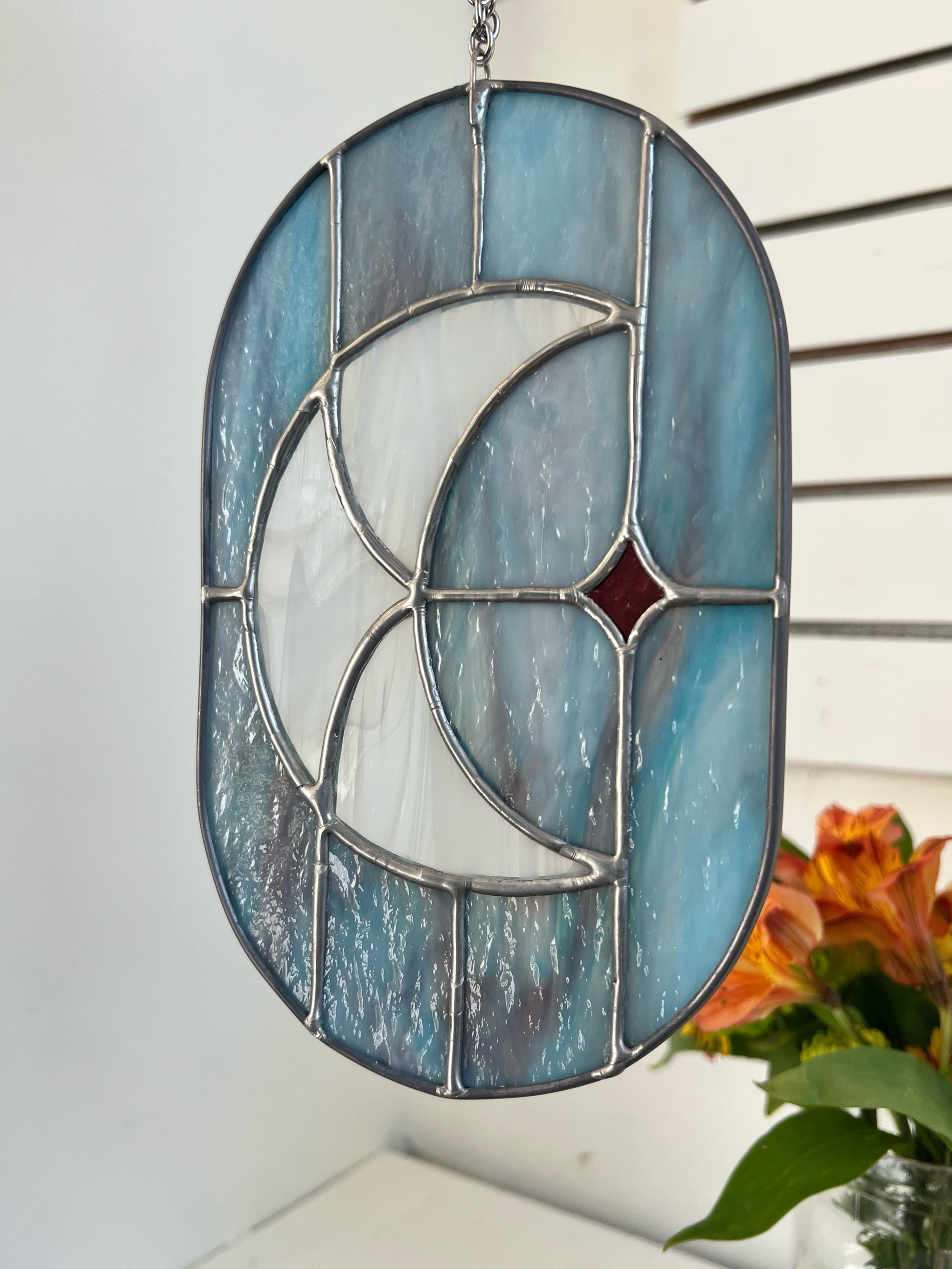 This handmade stained glass panel features a soft blue background with a crescent moon design at its center. Swirled shades of blue and white create a calming, night-sky effect, while a small touch of deep red adds contrast and balance. Perfect for hanging in a sunny window, this piece brings a peaceful, celestial vibe to any space.