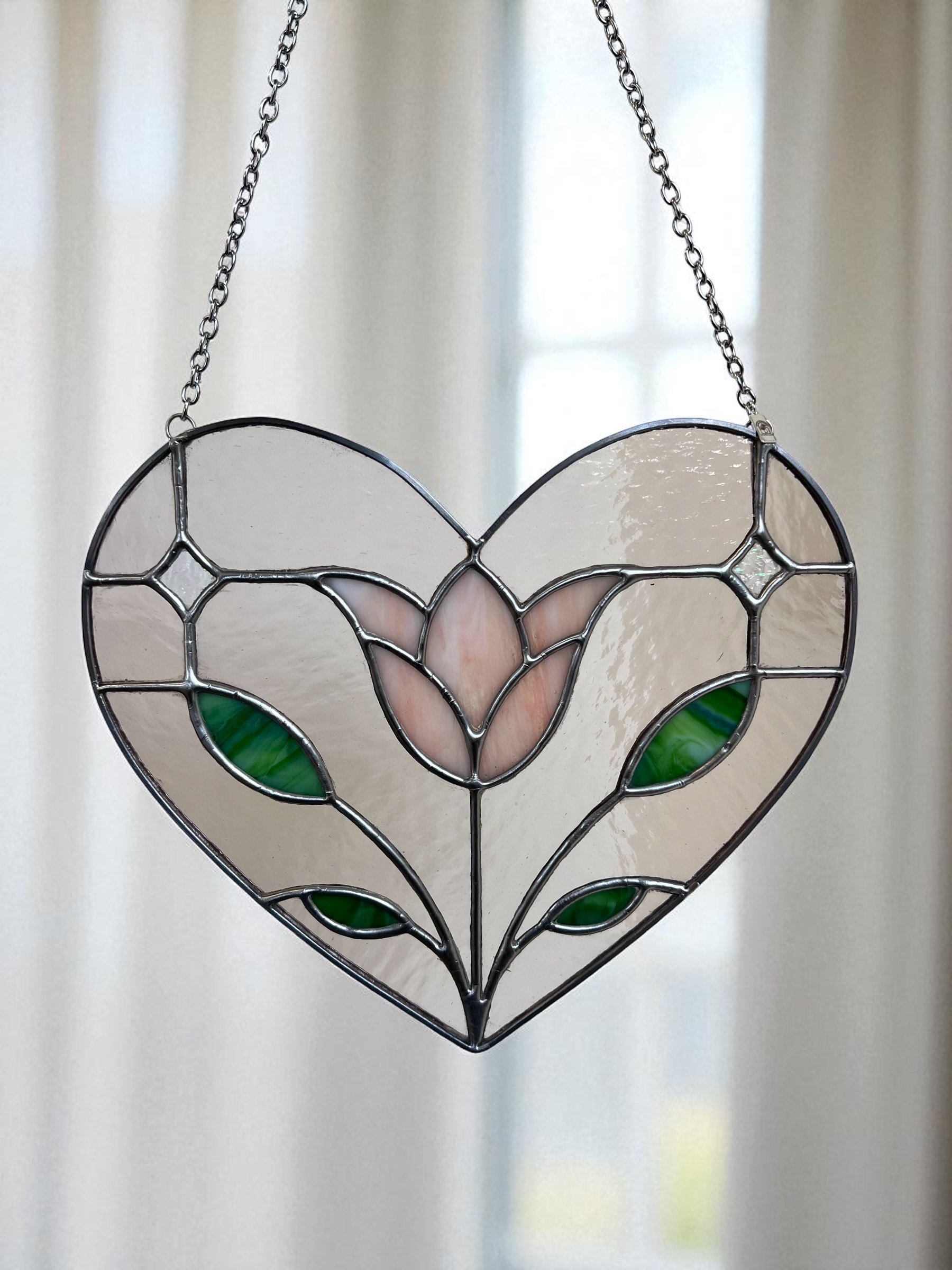 This handmade stained glass heart features a delicate flower design at its center, surrounded by textured clear glass and accented with vibrant green details. The mix of soft pink and green tones gives it a timeless, romantic feel while the clear textured glass lets the light shimmer through beautifully. Perfect as a heartfelt gift or a charming piece of window art for your own space.