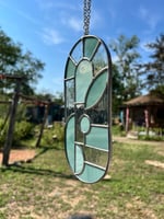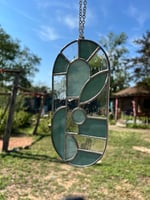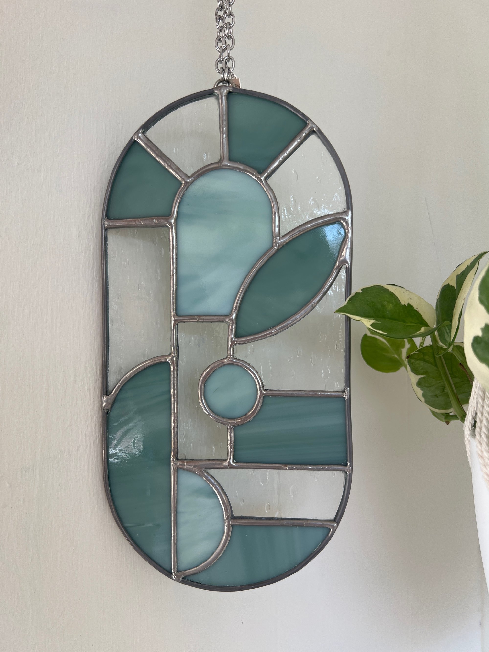 This stained glass piece mixes soft green glass with clear textured sections in a playful abstract design. The curves and circles give it an easy, organic feel, and it really comes alive when the light shines through. A simple, modern accent for any window.
