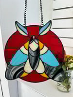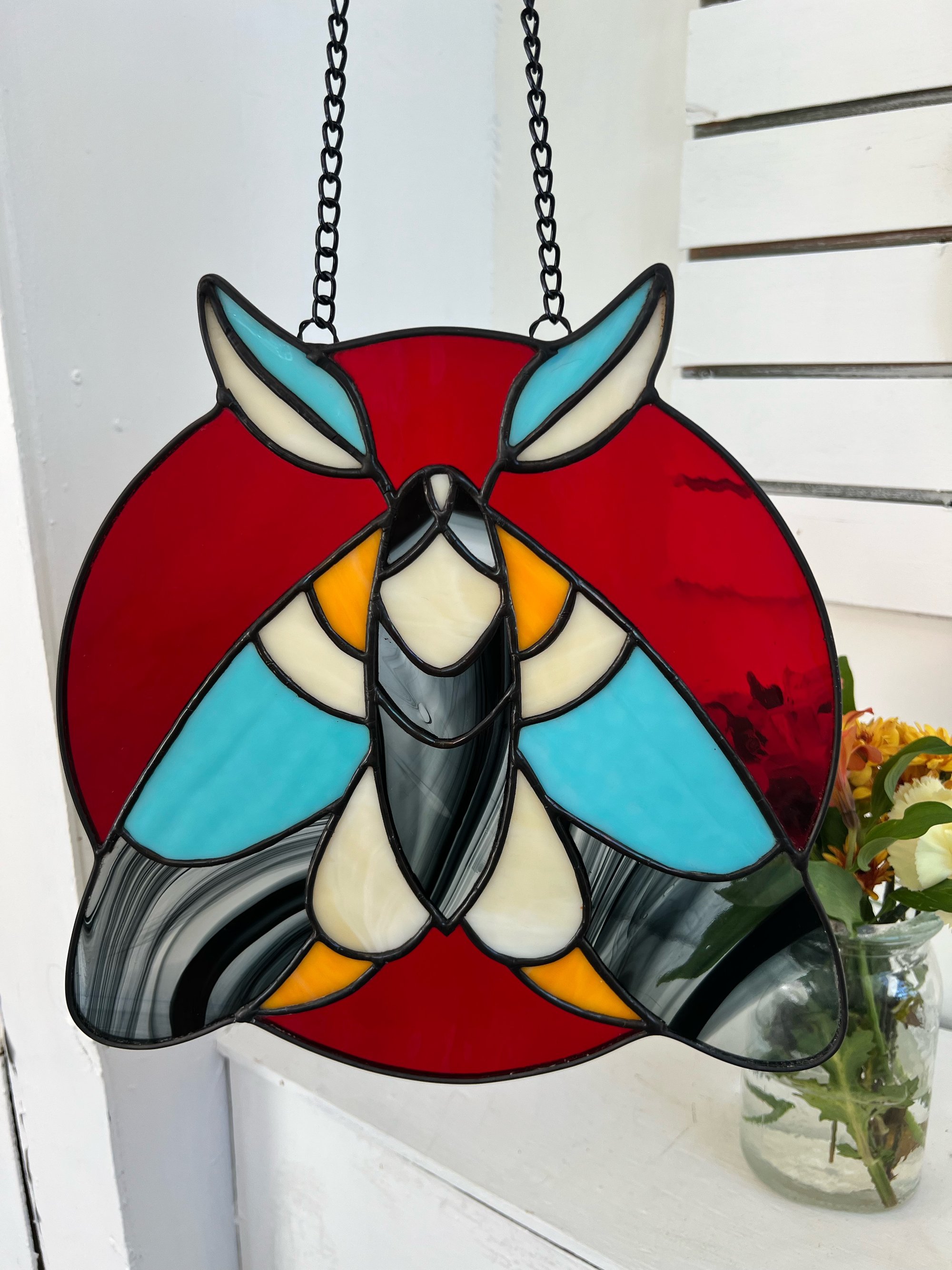 The Sweet Moth – Dark features bold stained glass wings in teal, cream, and marbled gray set against a deep red circle. Inspired by classic tattoo flash style, this piece has strong lines, vibrant contrast, and a dramatic look that shines beautifully in the light. A striking statement piece for moth lovers, tattoo enthusiasts, or anyone drawn to bold, nature-inspired art.