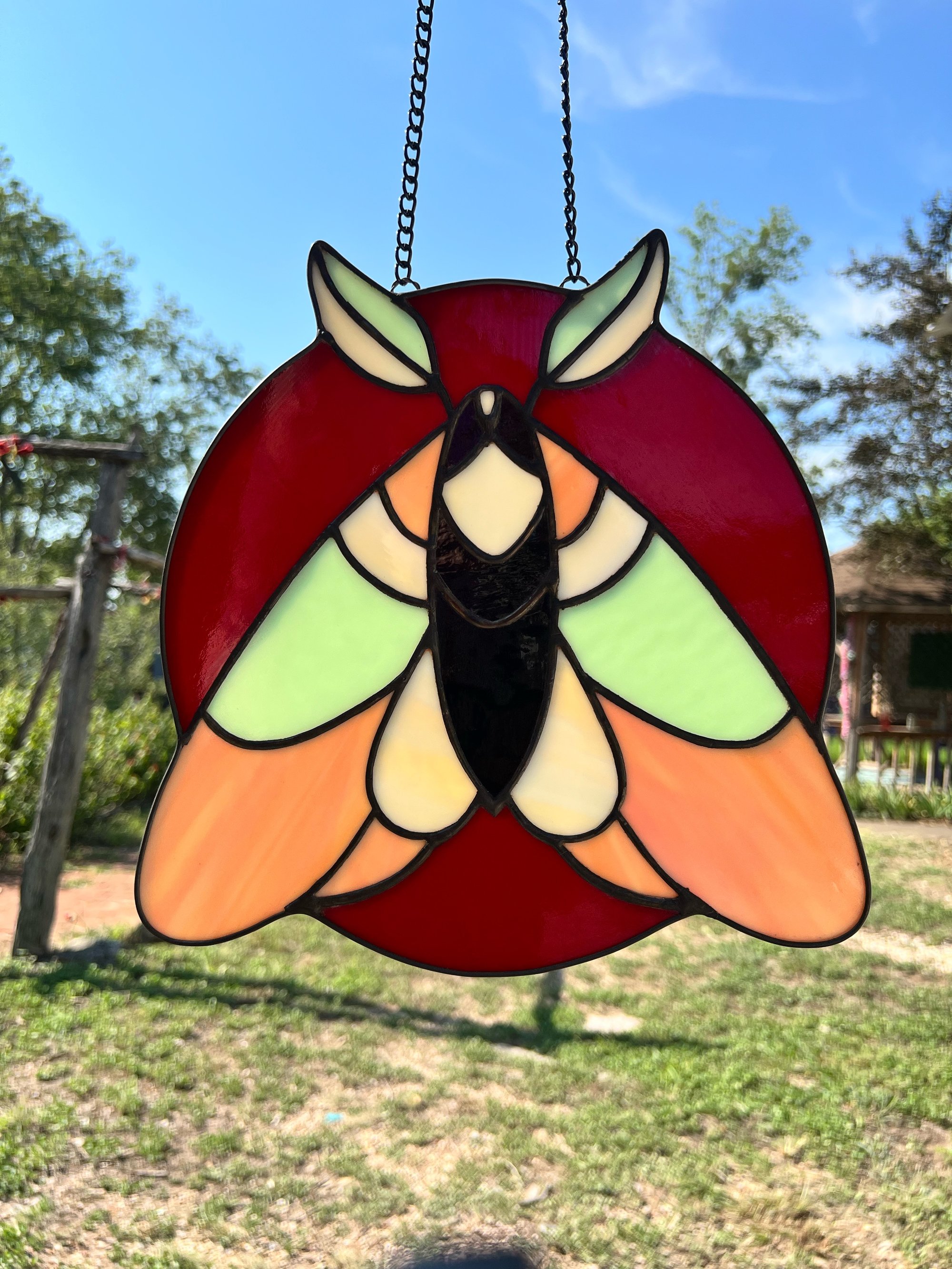 This handmade stained glass moth is inspired by classic tattoo style, featuring bold lines and striking shapes. With soft shades of green, peach, and cream set against a deep red background, the design has a timeless, vintage feel. The strong contrast and vibrant colors glow beautifully in natural light, making it a standout piece for anyone who loves stained glass, tattoos, or nature-inspired art.